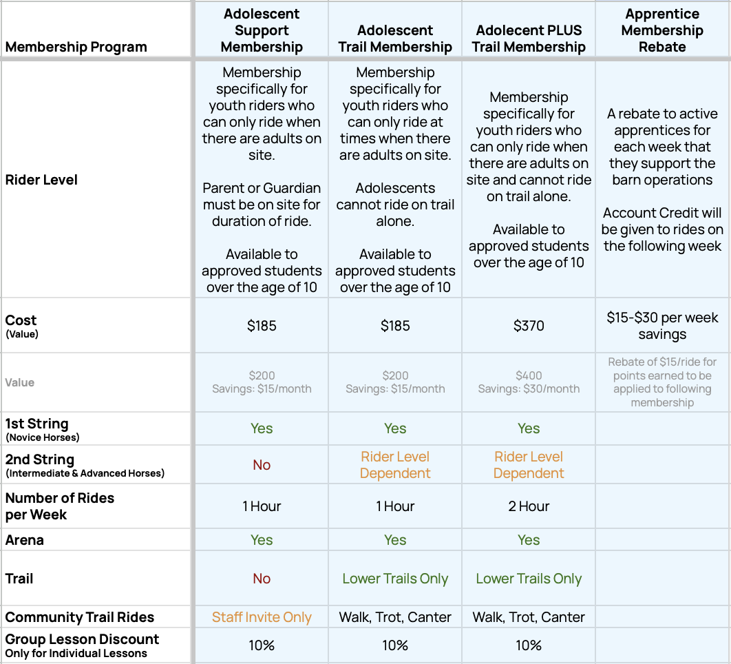 The Adolescent PLUS Trail Membership allows an extra hour of riding each week.