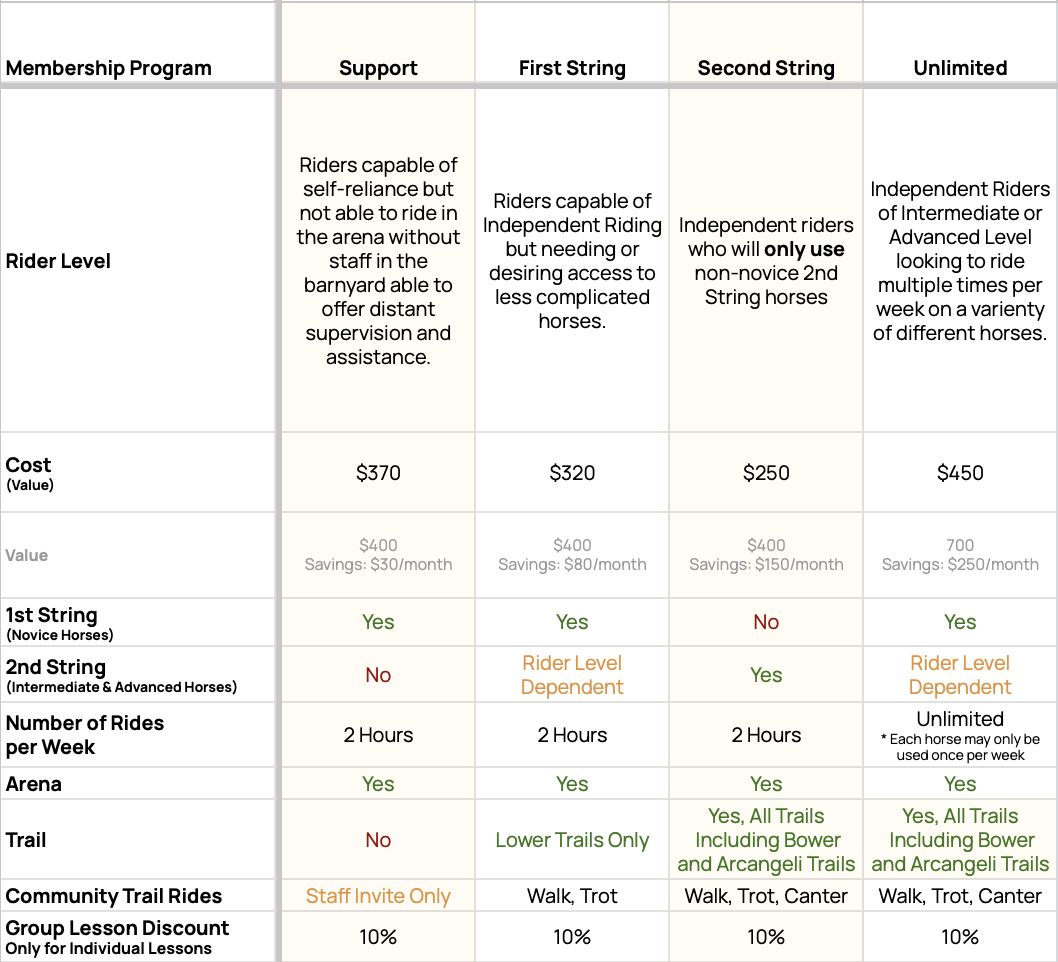 With the Pro Membership, access is only granted to our second string of more advanced horses and horses that require a bit more sensitive riders when riding unsupervised. These horses also tend to be more available as they are less needed for beginner level trail riders and lesson students. For those who want access to our first string horses who are more novice based, a First String Membership is required.