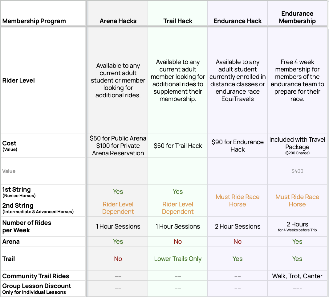 There are different levels of memberships available depending on the skill of the rider and the number of rides desired a week.